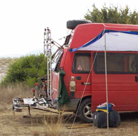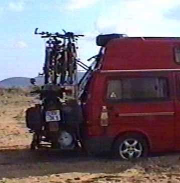 FahrradträgerZuerst einaml war die suche nach einem passenden Fahrradträger für die Flügeltür des Busse für 4 fahrraäder. Da es nichts passendes gibt, haben wir uns für einen leichten Alu Träger von Fiama für die Heckklappe Endschieden. Auf diesem Sitzen die Fahrräder schön tief (leichtes Be und Endladen). Mit dem Stahlträgern von Paulchen hatten wir am T3 Joker schlechte Erfahrungen gemacht, da uns diese (wir hatten 2) mehrfach abgeknickt sind. Die Montage ist auch kein Problem, da Form der Flügeltür und der Heckklappe gleich ist, es ist nur ein wenig Gefummel die unter Befestigung bei geschlossener Tür anzubringen, was sich durch andere Schrauben auch erleichtern lässt. Wir müssen zum Glück so gut wie nie Hinten aufmachen, da Hinten alles mit Küche und Bad zugebaut ist, die zwei 5 Kg Gasflaschen im Carthago reichen auch bei Täglichem Warm Duschen von 5 Personen gute 4 Wochen. Der Fahrradträger wurde dann aber noch mehrfach umgebaut, zuerst als Reserveradträger